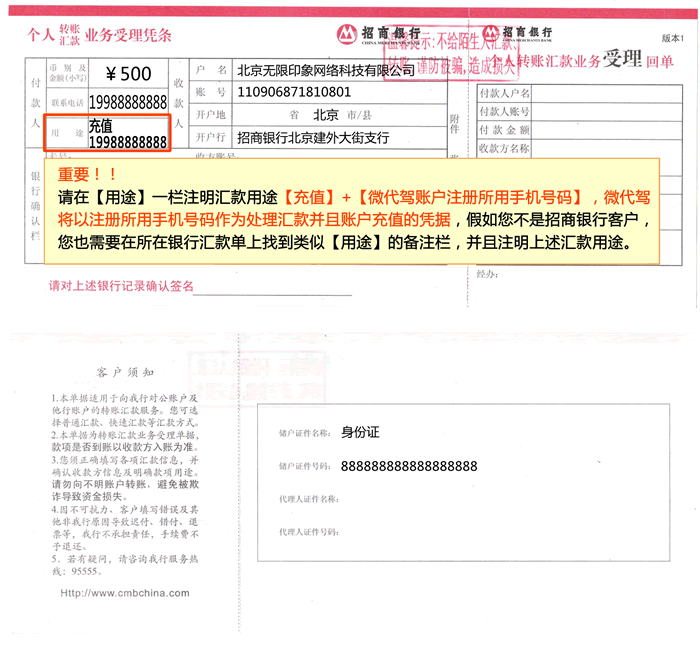 【充值】+【微代驾账户注册所用手机号码】,微代驾将以注册所用手机号码作为处理汇款并且账户充值的凭据。假如您不是招商银行客户,您也需要在所在银行汇款单上找到类似【用途】的备注栏,并且注明上述汇款用途。例:中国银行汇款单类似备注栏的内容标题为【用途及附言】。