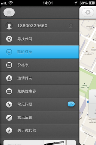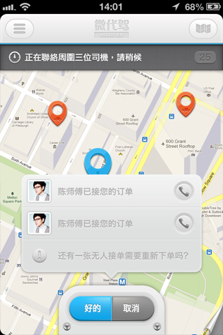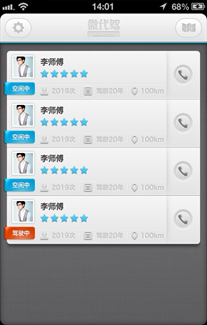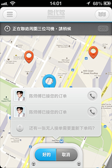 在司机的智能手机上安装微代驾司机端,手机可以自动定位司机位置,有代驾需求的客人通过微代驾乘客端可以看到附近有哪些司机。乘客下单方式有两种:一是直接拨打某位司机的电话联系,二是可以通过语音下单,周边多个司机收到语音提示后可以抢单,第一位抢单的司机成功接单。语音提示单都会告诉司机乘客什么时候用车,抢单之前,司机一定要算好时间,如果到那个时候没有把握到达乘客指定的地点,切勿抢单,对于抢单又没法在约定时间赶到的司机,我们会根据情况严重性给予屏蔽一周到解除合同的惩罚。